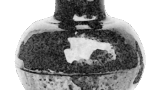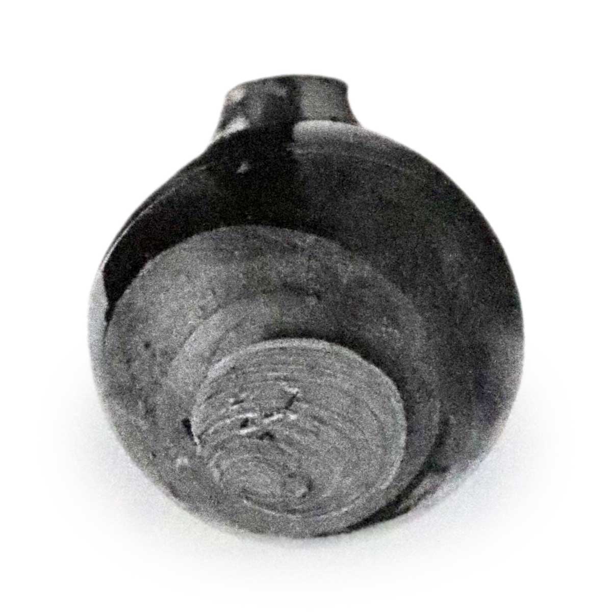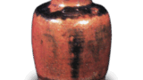 口作丸く拈り返し極めて淺く、頸締り、腰を廻れる沈筋一部途切れたる處あり、底廻り半分高く半分低く、朱泥色の土を見せ其上を轆轤三段に繞り底糸切細かく、其内に釉飛びあう、總體黑飴飛釉麗しく中にポッボッ砂目見ゆ、内部口緣釉掛り、以下轆轤極めて淺く繞る全體黑飴色にて、景趣判明ならざれども釉質精良にして頗る上品なる茶入なり。