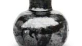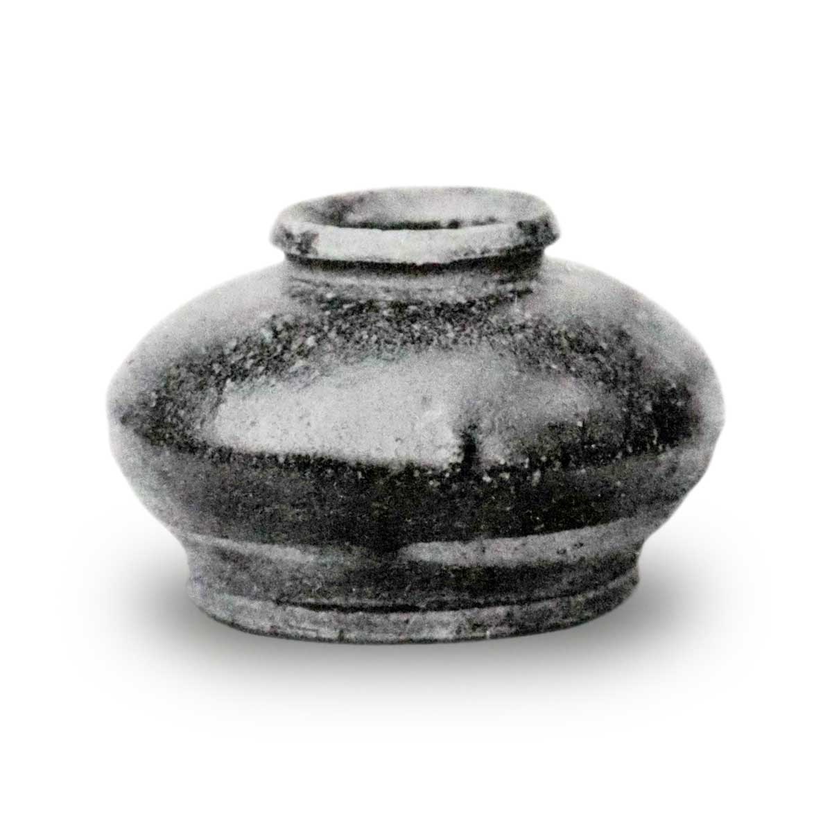 口作兩そぎ飯極めて低く、肩廣く撫で、胴より以下窄まり、底は圓座形にて、板起しの平面中央に、江月筆朱漆靈龜の二字あり。總體光澤なき黑澁釉中に、砂目の如くブッーと白星あり、裾以下白鼠色土を見せ、圓座廻り篦目一段を成す、内部口縁にのみ釉掛う、以下轆轤目荒く繞る、所謂島物にて、呂宋壺に見るが如き荒目の土味あう、其形龜に類するを以て此名を冠せられ、遠州、江月、道春三人の力に依りて、名物の列に加はりたる者にして、一風變りたる珍器と謂ふべし。
