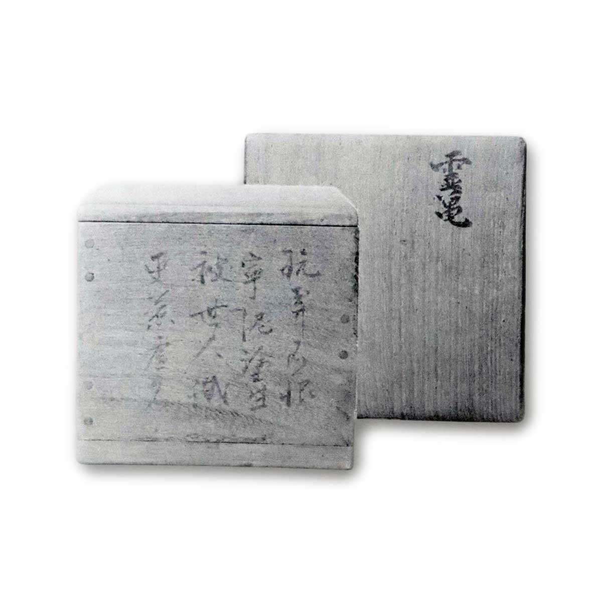 靈龜 島物 小堀和泉守所持。高一寸九分半九分の所もあり、胴三寸五リン口一寸三分、飯三分、底二寸三リン、靈龜と茶入の底に朱にて文字あり。箱の四方書付有江月和尚筆(書付略ス)。朱書入此書付江月和尙の手跡とは不見、寫したる人の筆の樣に見え候へ共、是儘に寫し置ぬ。 (箒庵文庫甲第十三號)