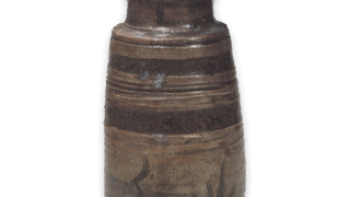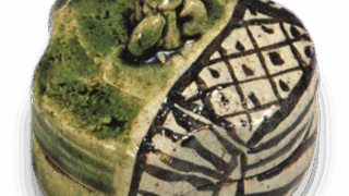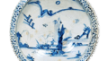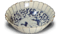 縁を鐸状にした大鉢で、初期伊万里染付中最も見事な大作である。一気に轆轤ぴきしているが、欠点の多い有田の磁土でこれほどの大作を焼造したことは大いに注目すべきところであろう。見込に描かれた山水画には、単に素朴さというよりも、抽象化された絵画性がうかがわれる。どのような陶画工が、いかなる示唆を得てこのような絵付をしたのか、まことに興味深い。縁文様は三方に菊花文をあらわし、地には無造作に点斑文をうっているが、この種の大鉢のほとんどは黒牟田山辺田窯で焼かれたものである。口径に比して高台は極めて小さく、約四分の一の大きさであり、裏面は無文である。