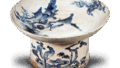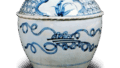 頸の高い、撫でた肩の円形の壺で、その器形は明らかに李朝風である。しかし肩のまるみや全体のバランスに李朝にない和様の趣が感じられる。頸部には錨歯状の蓮弁風の文様をめぐらし、胴の二方には独特の太い土埃を三段にあらわした山水風の文様を描いているが、その描写もすでに李朝風ではなく、和様に化している。肩の四方に耳がついていたらしいが、今はすべて欠失している。素地はかなり粗放で、随所に穴があらわれている。高台をかなり深く削り込んでいる。