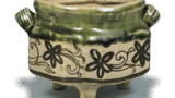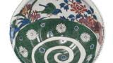 染付 楼閣 山水文 掛花生 古伊万里染付 楼閣 山水文 掛花生 2016.06.202023.10.12 染付 楼閣 山水文 掛花生 高さ23.0cm 口径6.2cm 底径5.8cm おそらく掛花生として作られたものと思われ、背面に釘をつけて掛花生にしている。頚部に四方筰文、胴には山水文をあらわしているが、このような形の作例は極めて類が少ない。おそらく寛永年間後期以後の作と推測される。