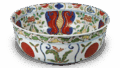 高台の低い、ゆったりと椀形に立ち上がった、伊万里型物としては類例の少ない鉢である。見込には大振りの柚の折枝文を白地に染付と青、黄などでくっきりとあらわし、縁回りには六方に窓をもうけて菊と牡丹の文様、地は赤地に白抜金彩で唐草をあらわし、外側には唐花文を六方割の内に描き、間に菊文様を配している。伊万里型物独特の華麗な配色である。高台内中央に一重の円圏を染付であらわし、目跡が一つ残っている。伊万里型物のなかでは、このような形式のものを俗に準型物と呼んでいるが、本型物と準型物との区別が、いつ頃からどのような基準によってなされたかは判然としない。