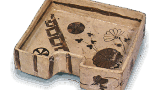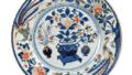 これらは俗に髭皿と呼ばれているが、円形の鐸をもつ皿で、一部を半円に落とした形はまさにシェーピング・ディッシュのようである。第191図は古伊万里独特の表現で、前図と似た時代のものであろう。色調の濃い染付と赤、緑、黄、金彩などで、牡丹と菊の文様をのびやかにあらわしている。裏面の三方には撫子など草花の折枝文をあらわし、高台には櫛目文様をめぐらしている。第192図は典型的な和風の文様で、屏風の陰に寛文美人、庭に桜を配し、さらに縁側を薄い染付であらわし、その横に手洗鉢が置かれている。回りには蝶と菊を唐草風に描いているが、この種の髭皿のなかではことに優美な絵文様のものである。裏面には、二方に染付と上絵で梅の折枝文をあらわしている。