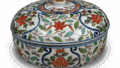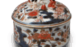 色絵 群雀文 蓋物 古伊万里色絵 群雀文 蓋物 X Facebook はてブ LINE Pinterest コピー 2016.09.122024.01.24 色絵 群雀文 蓋物 通蓋高19.8cm 身高12.0cm 口径25.5cm 底径16.4cm これも甲盛りの蓋のついた蓋物であるが、高台が大きく、胴の張った器形は伊万里型物に見る一連の作風のものである。身蓋とも三方に独特の花文様をあらわした丸文を配し、間に群雀を散らした珍しい構図のもので、作振りはいささか下手であるが珍器といえる。