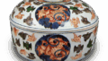 色絵 牡丹菊文 蓋物 古伊万里色絵 牡丹菊文 蓋物 X Facebook はてブ LINE Pinterest コピー 2016.09.132024.01.24 色絵 牡丹菊文 蓋物 通蓋高14.1cm 身高8.0cm 口径I3.4cm 底径7.2cm 甲盛りの蓋の上に酒盛りをする人物像を三つ配したものであるが、この種のものがやはり輸出磁器のなかにかなり見られ、さまざまな彫像がつけられている。染付と赤、金、黒で菊と牡丹がのびやかに描かれているものが多い。