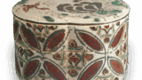 色絵 牡丹菊文 蓋物 古伊万里色絵 牡丹菊文 蓋物 2016.09.132024.01.24 色絵 牡丹菊文 蓋物 通蓋高14.1cm 身高8.0cm 口径I3.4cm 底径7.2cm 甲盛りの蓋の上に酒盛りをする人物像を三つ配したものであるが、この種のものがやはり輸出磁器のなかにかなり見られ、さまざまな彫像がつけられている。染付と赤、金、黒で菊と牡丹がのびやかに描かれているものが多い。