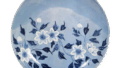 染付の三脚大皿の代表作。低い高台回りに菊葉形の脚を三方につけた通例の形式ですが、全体にやや大振りで立上りが浅いです。ここでも最上質の白磁胎が用いられ、成形、染付とも一点一画おろそかにしない精緻さを示しています。面白く枝を張る松の大樹を円形の画面をうまく使ってあらわしていますが、その松の幹や枝のむらのない薄い染だみは驚くべき巧妙さであり、まるく描かれた松葉は細い線を墨はじきで白抜きし、染付に濃淡の変化をつけて画面に厚味を出すなど、まことに巧緻なもので、技巧的には中国明、清の染付を凌ぐものがあります。側面三方脚部の上に、枝を開いた木蓮らしい折枝文様を配していますが、その染付も極めて優美で、花は淡く葉は濃くあらわされています。広い蛇の目高台には針積みの目跡がありますが、この形式の三脚皿はいずれも作行きが優りなさい. 大皿でも特別調製品であったように思われます。