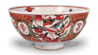 蒲公英を五株上下二段にあらわしています。春の野辺に咲く雑草ともいえる蒲公英のみで一つの文様を構成しているのは、おそらく色絵鍋島以外には見ないでありましょう。藩窯であったから吉祥文を多く好むのは当然ですが、このような素朴な材料をとりあげ、色絵の美しさのなかに生かすのも鍋島の特色で、その意匠の選択が決して形式主義的でないのが、江戸時代中期の大藩の御用窯の作としては興味深いです。やはり七寸皿の代表作の一つで、染付、色絵ともに理想的に焼成されていますが、ことに葉の緑の発色が群を抜いて鮮かです。外側は、例によって六個の七宝文を結んで一つのパターンとした七宝結文を三方に、高台には櫛目文をめぐらし、高台畳付の胎土はやや赤く焼き上がっています。五客揃っています。