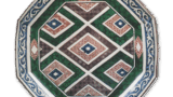 色鍋島 色絵 水仙文 五寸皿 日本色鍋島 色絵 水仙文 五寸皿 2015.10.122024.01.27 色鍋島 色絵 水仙文 五寸皿 Dish with daffodil design. enamelled ware高さ4.1cm 口径14.8cm 高台径7.8cm 水仙文の皿は何種類かありますが、地に墨はじきの青海波文をあらわしたこの皿が最も優れています。赤で線描きした白水仙の意匠は、例によって淡泊なうちにも優美さが感じられ、外側には空木の花のような折枝文が三方に配された、珍しい裏文様の皿です。高台は櫛目高台。