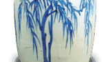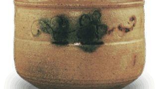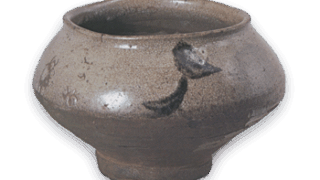 三角に近い四稜花筒形の猪口です。古鍋島に属するもので南川原の窯で焼成されたものでしょう。胴に二羽の鸚脊と松の図をあらわしていますが、色絵の下に薄い染付の線で描かれている骨描きは大河内窯のそれのように精緻なものではなく、自由な動きがあります。鳥が宿る松の幹は染だみのぼかしにしていますが、それもまた無造作にあらわされています。古鍋島猪口のうち第一の優作といわれるのは、二羽の鸚寄をあらわした文様の面白さと、羽根を色どった緑の上絵の鮮かさ、薄赤ぽかしの鳥の胸に濃い赤で羽毛を点じた着彩の面白さを賞味してのものでしょう。染付の松の葉もやや太くしっかりと描かれています。円形の高台がついています。