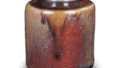 肩から胴にかけて黒み・白鼠色・織部色が縞様を呈し、その一部に大小十二個の点が縦一列に並び、また火変りもあって景色をなしています。