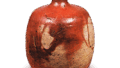 緑釉の釉切れが赤く辰砂に窯変していますのも巧まざる景色となっています。この種の手鉢や蓋物など、型抜き成形もの共通の布目が内面に残り、また見込に目跡が三つ残っています。