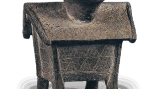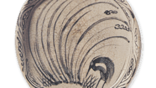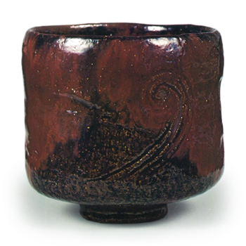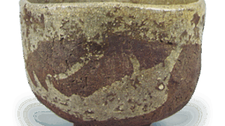 歪みのある沓形茶碗は織部好みと伝えられ、全体に黒釉のかかった黒茶碗を織部黒と呼んでいます。 この茶碗は織部黒の優作で、大振りに力強く成形され、口や胴に目をつけ、 漆黒に溶けた黒釉が高台まわりを三角形に残してずっぽりとかかっています。 おそらく天正の末から慶長初期の作でしょう。