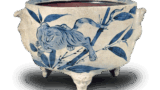 対角線を境に一方には黒釉をかけ、一方には絵付けをしていますが、黒釉のかかった側面にも、白抜きの紋様が釉膚を掻き落として現わされ、一方の絵紋様も横縞にうずを配した珍しいものであり、上に薄くかかった白釉をとおして、鋳色に発色しています。