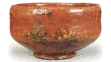 ところでこの茶碗は、黒織部の沓茶碗としては、珍しくすなおな、端然とした削り出しの高台がついていて、変化に富んだ上体に比して単調にすぎるかの感を抱きますが、一面、そのさりげない作ゆきが、かえって茶碗の形姿全体を、いやみのないものにしているともいえます。