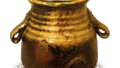 織部 串団子文 香合 日本織部 串団子文 香合 X Facebook はてブ LINE Pinterest コピー 2014.07.202024.01.26 織部 串団子文 香合 Oribe Incense caddy with design ot kushi-dango (dumpling on spft)高さ3.6cm 口径3.9cm 三脚 ざんぐりとした姿の香合で、 底を削って低く三脚状に作っていますが、おそらく手捏ねでしょう。 身、 蓋とも半面に緑釉をかけ、 半面には蓋甲に串団子、 側面に横筋文様を筆太に描き、 長石釉をかけています。釉膚はやわらかく焼き上がっています。 織部香合のなかでは特に味わい深い名器であります。