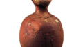 織部 耳付 振出 日本織部 耳付 振出 X Facebook はてブ LINE Pinterest コピー 2014.08.292024.01.26 織部 耳付 振出 Oribe Furidashi (small pot for sweets) with handles高さ1O.1cm 口径2.2cm 底径5.4cm 畠山紀念館 日では茶人の間で振出に使われているが、本来は油壺にでも作られたものか判然とはしない。いずれも織部らしい飄逸味のある作振りであるが、裏面に籠目文、正面には花か鳥か判然としない絵がおもしろく描かれています。平らな底に糸切りの跡が残っています。