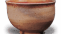 薄造りで、口縁は一部やや端反り、赤い素地に失透釉がかかり、釉肌はカセて微妙な色合いを呈します。