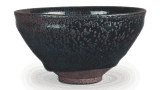 重文、大名物。土は黒褐色の建窯独特のもので、高台が比較的大きく、全体にやや開き加減の作です。