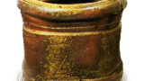 黒茶碗 銘松年 日本黒茶碗 銘松年 2017.03.082024.01.27 黒茶碗 銘松年 高さ8.1cm 口径11.2cm 高台径5.1cm やはり一連の作行きで、胴を僅かに締め、腰はくっきりと曲がっていますが、腰から高台際にかけてはまるみが強いです。高台は低く、まるみのある畳付は広いです。釉はかせ柚で内部は特に赤みが強いです。内箱蓋裏には不見斎が「長治郎 黒 茶碗 松年(花押)」と書き付けています。