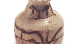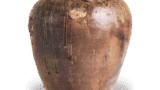 この茶碗にも高台内中央に楽字の印が捺されています。柚が厚くかかっていますので、前図同様の印か、あるいは常慶印といわれている印かは判然としません。作行きは図43の「次郎坊」と似て口部を内に僅かに抱え込ませた穏和な作行きで、いわゆる利休形です。内側に段をつけ、見込には小振りの茶溜りをつけ、全体にかかった釉は、褐色をおびているがよく溶けて少し光沢があります。内箱蓋裏には「二代目黒茶碗 銘志は栗 左(花押)」と如心斎が箱書付しています。これも高台内に捺されている印を常慶印と判断したため、二代目と書き付けたのでしょう。