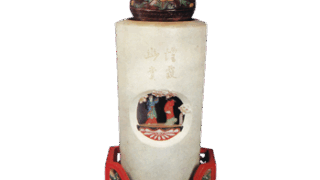 独特の器形をした阿古陀形の香炉ですが、胴の上部四方に牡丹と獅子の型抜きの置上文様を交互に貼り付けています。この牡丹と獅子の置上文様は図92の「二彩瓜文平鉢」の縁にめぐらされたものとまったく同様です。ところが、この香炉の高台には常慶印が捺されています。したがって、天正年間後期から寛永年間頃まで、楽家ではこの種の型による置上文様をつけた作品を使っていたことがうかがわれ、それらが長次郎だけではなく彼以外の楽焼の工人たちも常用していたことは明らかです。黒楽柚がかかっているが全体褐色に焼き上がり、口回りには白柚がかけられています。土は明らかに聚楽土が用いられ、高台の作りは茶碗と共通のものです。
