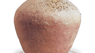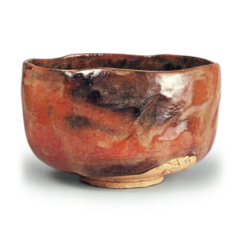 これも阿古陀形の香炉で、常慶印が高台内に捺され、高台回りを残して白柚がかかっています。興味深いのは、この香炉とまったく同様の作行きのものが、二代将軍秀忠の遺骸が葬られていた東京の芝増上寺の墓所から発見されたことで、常慶作の香炉が二代将軍徳川秀忠の遺骸の前に置かれていたことは、徳川家と常慶時代の楽焼とのつながりを明確に物語るものであり、歴史的資料として貴重なものといえます。胴の六方に縦筋をめぐらした阿古陀形の香炉で、口造りは矢筈風に、高台は前図と同じく茶碗のような高台がつけられています。