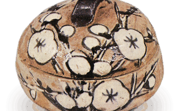 乾山 乾山流水文手桶水指 けんざんりゅうすいもんておけみずさし 乾山流水文手桶水指 けんざんりゅうすいもんておけみずさし乾山鳴滝時代の作。珍しい手桶形。たが帯二本をめぐらし、手の幅広く、厚みのある蓋で、全体にきわめて力強い作です。褐色の素地に一部白がけを施し、銹絵... 2023.10.07 乾山日本水指茶道美術鑑賞辞典