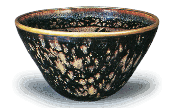中国 玳玻盞天目茶碗 たいひさんてんもくちゃわん 重文、中興名物。一名「文字天目」。形はやや開きぎみの椀形で、外面は黒地黄斑の玳玻釉である。内面の文様は、三つの花菱輪違文の中に「富貴長命」つ金玉満堂」「福寿康寧」の四字句が浮かび上がっている。このよう... 2011.11.19 中国中興名物茶碗茶道美術鑑賞辞典重要文化財