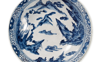 古伊万里 染付山水文大鉢 高さ10.3㎝ 口径45.4㎝ 底径12.7㎝大和文華館 初期染付大鉢の代表的な名作の一つである。器形は、第1図と同様の作振りで、大きな眺望の山水画を円形の見込に大胆に描いている。中央に帆掛舟が二艇、左方近景の奇巌には梅 […] 2012.07.13 古伊万里日本日本の陶滋
