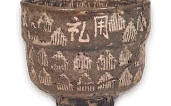 古唐津の流れ 三島唐津茶碗 銘「蓬莱」 高さ8.6cm 口径11.8×3.1cm 高台径6.1cm 三島風の白黒象嵌文のある作品を三島唐津と呼び、内田小峠、大草野、百聞窯などから陶片が出土しているが、この茶碗は大草野、あるいは小峠の作ではないかと推測されている […] 2013.11.19 古唐津の流れ唐津日本日本の陶滋茶碗