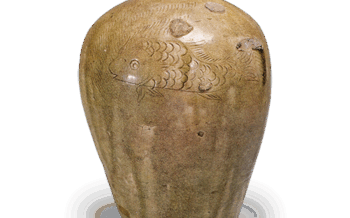 中世瀬戸美濃 瀬戸 灰釉魚文瓶子 瀬戸 灰釉魚文瓶子Seto ware: vase with fish design, ash glaze. Preserved at Höju-in, Hanaizumi-machi, Iwate. ... 2023.11.22 中世瀬戸美濃日本日本の陶滋重要文化財