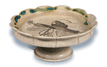 日本 織部 台鉢 織部 台鉢Oribe stem bowl高さ6.3cm 口径14.8cm 底径6.9cm 口部を輪花にした台鉢で、見込には根引きの小松らしい文様と葉の文様をあらわしています。縁に点じた緑釉がこの場合は... 2014.11.05 日本日本の陶滋織部