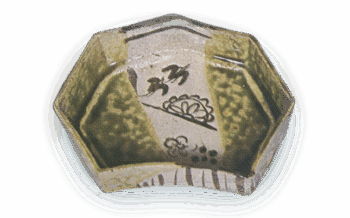 日本 織部 向付 織部 向付Oribe Five mukozuke bowls高さ4.9cm 口径15.1cm 三脚 七角異形の向付で、花文様に変化したと思われる水車らしい文様を中央に描き、梅花と燕二羽、側面にも燕と聞... 2014.10.22 日本日本の陶滋織部