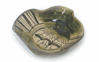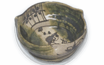 日本 織部 向付 織部 向付Oribe Mukozuke bowls高さ6.5cm 口径13.2cm 三脚 小振りの向付で、口部を押えて三方にしている、見込に市女笠の文様をあらわしています。これも五客揃っています。 2014.10.24 日本日本の陶滋織部