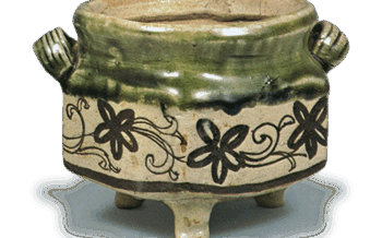 日本 織部 唐草文 耳付 香炉 織部 唐草文 耳付 香炉Oribe Incense burner with handles with flowering grass scroll design高さ8.7cm 口径9.1cm 三脚畠山... 2014.08.11 日本日本の陶滋織部