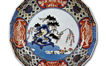 古伊万里 色絵 盆栽文 大鉢 色絵 盆栽文 大鉢高さ7.6cm 口径32.2cm 底径19.4cm 口部を十六角にした平らな鉢で、見込中央には島台と霞の文様をあらわし、外側には四方の枠内に赤地に白抜金彩で唐花文を配し、間には丸文、... 2016.07.24 古伊万里日本日本の陶滋