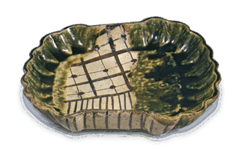 日本 織部 平鉢 織部 平鉢Oribe Shallow bowl高さ5.2cm 口径18.2×23.8cm 四脚 異形の平鉢で、いずれも類例は、極めて少ない。底の四方に脚がつき、柔らかく焼き上がっています。 2014.10.05 日本日本の陶滋織部
