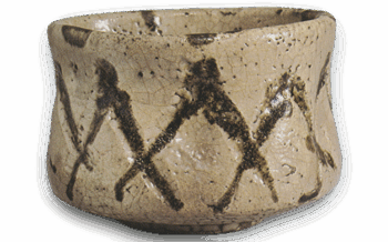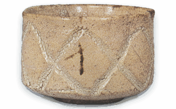 唐津 彫絵唐津 茶碗 高さ9.0cm 口径12.3cm 高台径7.2cm東京国立博物館 半筒形の茶碗で、高台は低く二重高台風に削り出されている。全体に厚手で、胴はまるく、口部は撫四方に作られている。胴には「×」形の深い彫文様を六個めぐらし、高 […] 2013.10.06 唐津日本日本の陶滋茶碗