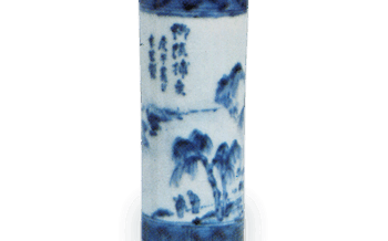 京焼 染付茶巾筒 染付茶巾筒Mokubei: chakin-zutsu, blue and whiteHeight 7.9cm高さ7.9cm 祥瑞写の茶巾筒、胴に山水人物の文様があらわされ、「柳陰捕魚庚午夏日 木米製」... 2024.03.19 京焼日本日本の陶滋