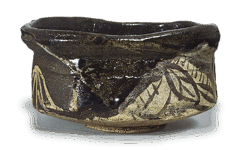 日本 黒織部 木葉文 沓茶碗 黒織部 木葉文 沓茶碗Black Oribe 'Shoe'-shaped tea bowl with leaf design. Kuro-Oribe高さ7.7cm 口径11.4×140cm 高台径5.... 2014.06.20 日本日本の陶滋織部茶碗