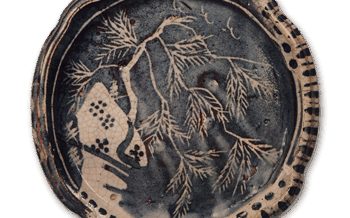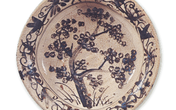 志野 志野 樹木文 鉢 志野 樹木文 鉢Shino bowl with tree designDiameter 28.8cm高さ9.5cm 口径28.8cm 三脚 見込いっぱいに樹木が描かれ、また開いた鐔状の部分には唐草文様... 2013.12.04 志野日本日本の陶滋