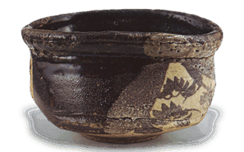 日本 黒織部 松文 沓茶碗 銘 羽衣 黒織部 松文 沓茶碗 銘 羽衣Black Oribe 'Shoe'-shaped tea bowl with pine-tree design. known as 'Hagoromo'. Kuro-O... 2014.06.18 日本日本の陶滋織部茶碗