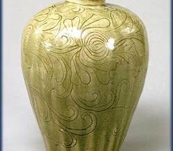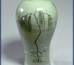 お話 象嵌 ぞうがん 青磁象嵌は高麗時代の朝鮮で独自の発達をとげた技法。胎土に文様を彫り込んで白土、赤土を埋め、いったん素焼き をしたのち青磁釉をかけて焼成しますと、白土は白く、赤土は黒く発色します。胴の一面に柳と葦、一面... 2011.02.26 お話原色陶器大辞典