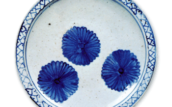 古伊万里 染付 菊花散文 皿 染付 菊花散文 皿高さ3.7cm 口径21.4cm 高台径8.6cm 鐔縁の部分に、後に有田で大いに流行する帯状文があらわされ、見込には菊三輪が描かれている。やはり稗古場の作であろうか。 2016.05.07 古伊万里日本の陶滋