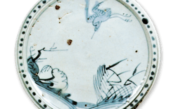 古伊万里 染付 葦鷺文 皿 染付 葦鷺文 皿高さ3.3cm 口径20.4㎝ 高台径8.1cm 葦鷺文様が軽妙な筆致で描かれている。左方には柳樹が配され、回りには大鉢などにも見られた点斑文が無造作に打たれている。 2016.05.17 古伊万里日本日本の陶滋