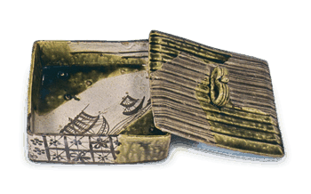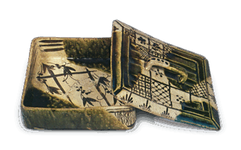 日本 織部 四方 蓋物 織部 四方 蓋物Oribe Square box with cover高さ11.3cm 口径17.0×18.6cm 三脚 蓋物には、四方のものが最も多い。なかには蓋が失われて、身だけが角鉢として使われ... 2014.09.25 日本日本の陶滋織部