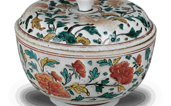 古伊万里 色絵 牡丹唐草文 蓋物 色絵 牡丹唐草文 蓋物通蓋高15.2cm 身高11.1cm 口径18.7cm 底径9.7cm東京国立博物館 従来古九谷と称されていたものであるが、その作風から推して初期の古伊万里赤絵と見るべきである。... 2016.08.16 古伊万里日本日本の陶滋