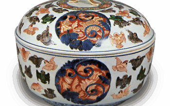 古伊万里 色絵 牡丹菊文 蓋物 色絵 牡丹菊文 蓋物通蓋高14.1cm 身高8.0cm 口径I3.4cm 底径7.2cm 甲盛りの蓋の上に酒盛りをする人物像を三つ配したものであるが、この種のものがやはり輸出磁器のなかにかなり見られ、... 2016.09.13 古伊万里日本日本の陶滋